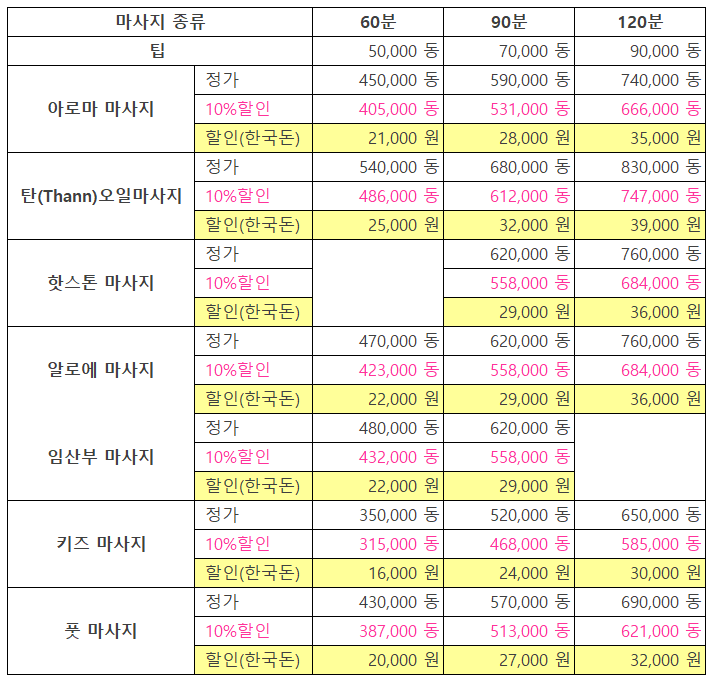 3. 마사지 가격 및 종류